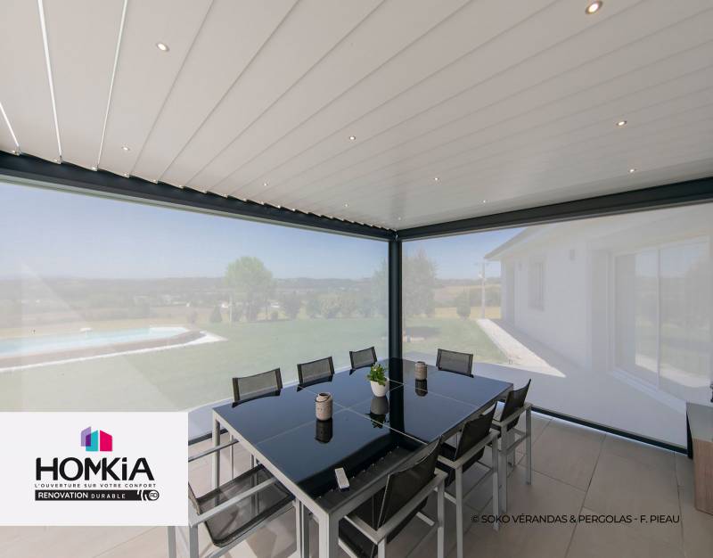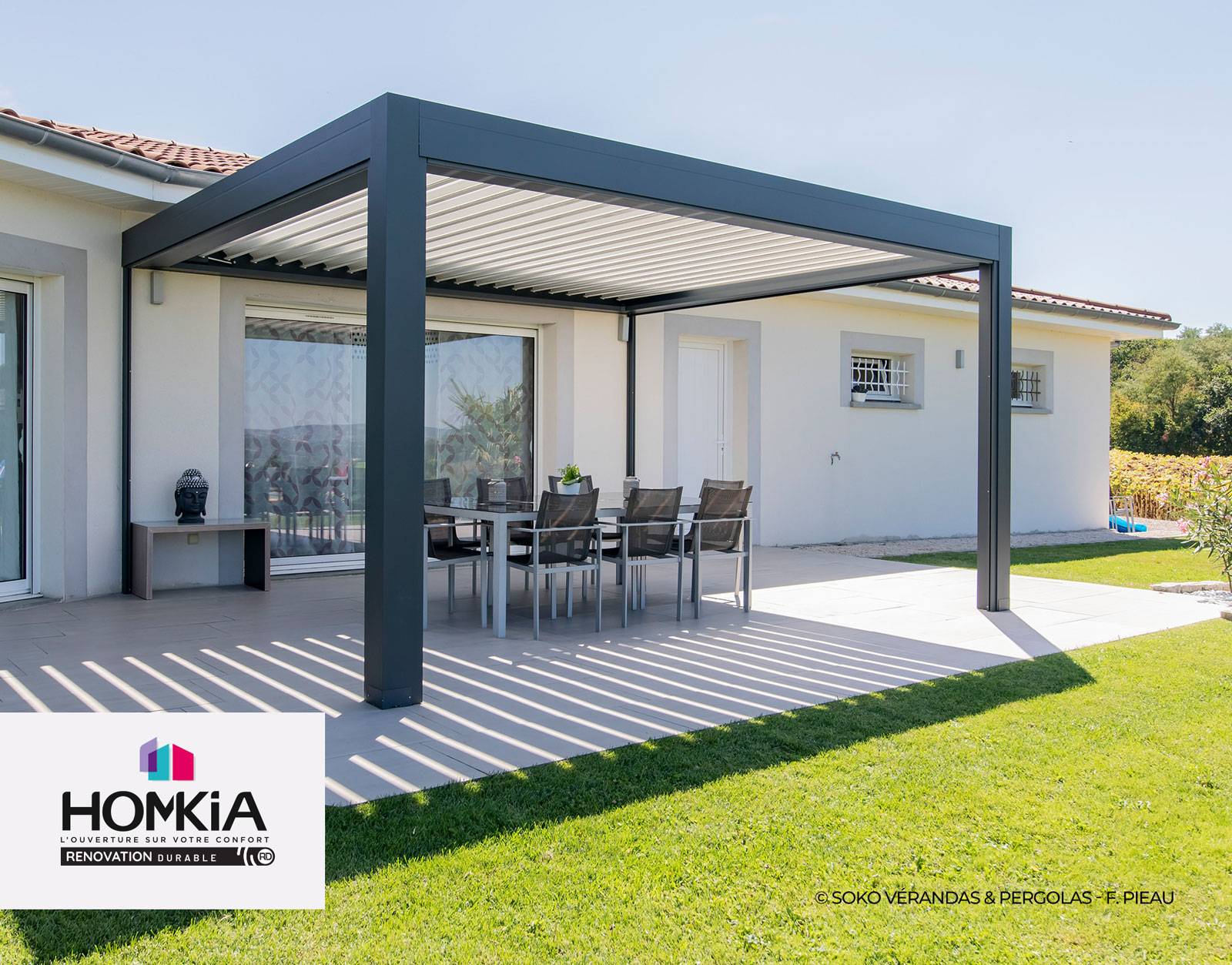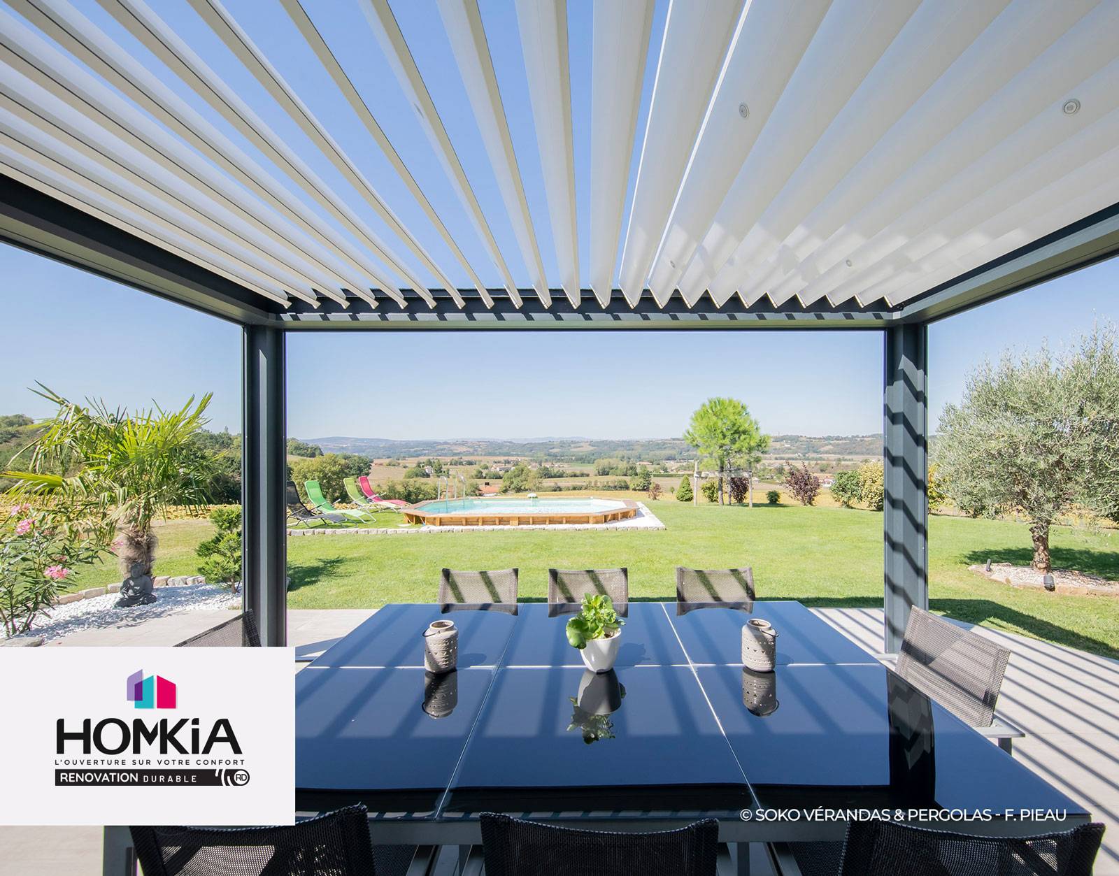 Avec Homkia Rénovation Durable, profitez d’un extérieur confortable toute l’année grâce à nos pergolas bioclimatiques sur-mesure.