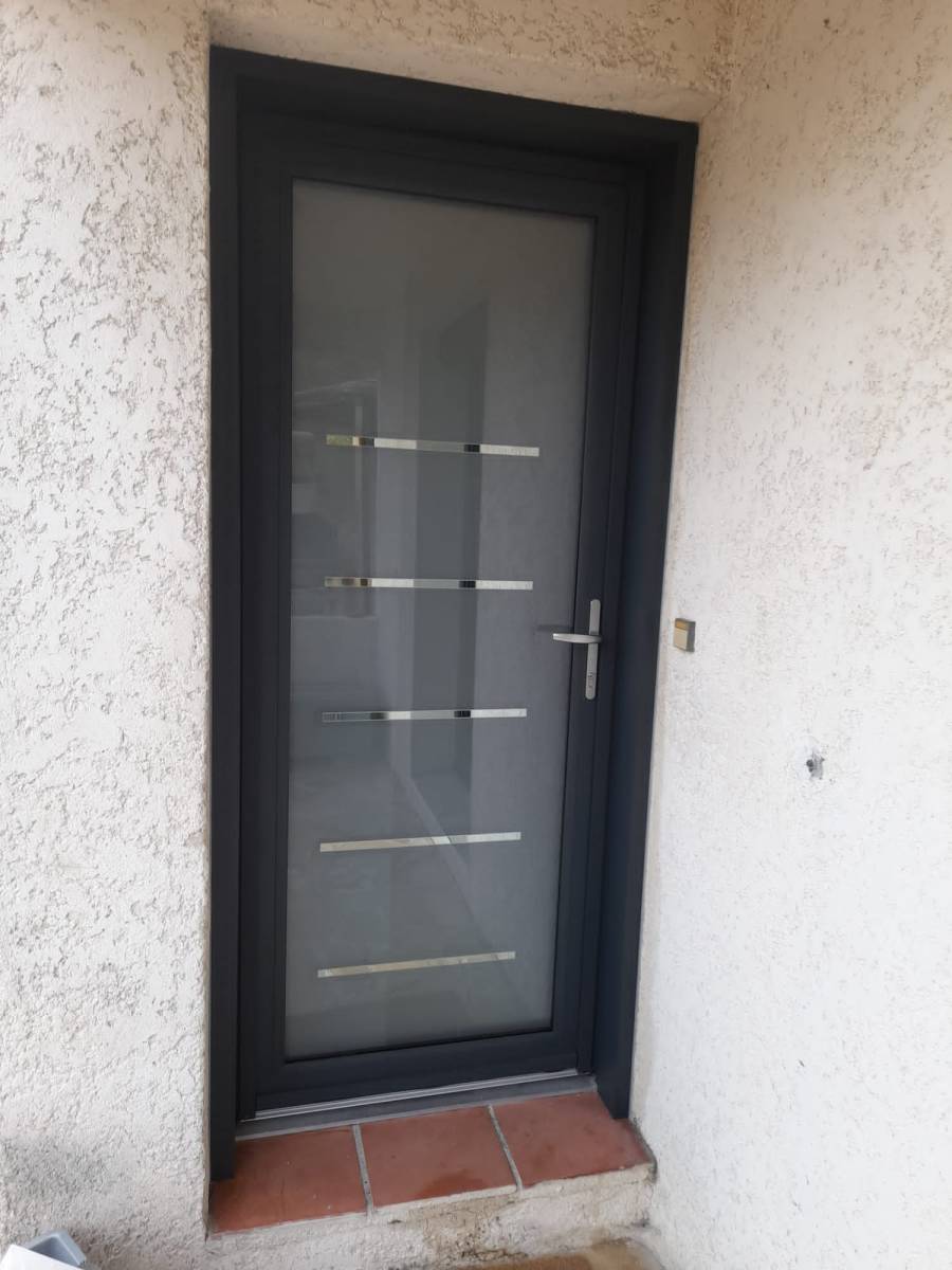 Dans ce projet, nous avons également réalisé la pose d’une nouvelle porte d’entrée sur mesure. D’un seul battant, l’ouvrant se fait sur l’intérieur. Aussi réalisé en aluminium RAL 7016, cette nouvelle porte s’intègre parfaitement dans le style moderne de cette habitation.